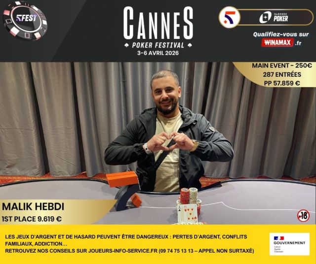 Malik Hebdi remporte le Main Event du Cannes Poker Festival 2026 (287 entrées, 57 859 € de prizepool) après un heads-up renversant face à Hicham Zebidi. Retour sur les résultats et les moments forts du festival sur la Croisette.