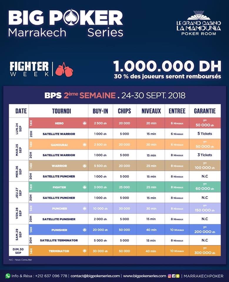 Du 24 au 30 septembre se dérouleront les Big Poker Series : une série de tournois avec des Buy-ins pour toutes les bourses : de 2 500 à 30 000 dirhams (de 250 à 3000 euros). 30 % des joueurs seront payés. Par ailleurs, de nombreuses tables de Cash Game seront aussi ouvertes pendant ces festivals.
