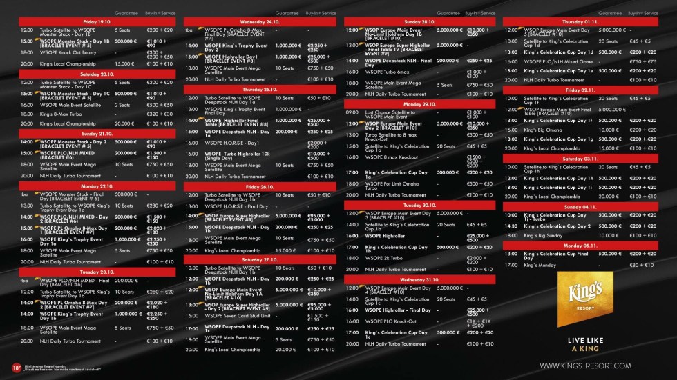 10 bracelets seront mis en jeu. La fine fleur du poker européen et mondial sera en lice sur ce festival événement. On retrouve plusieurs événements caractéristiques de la franchise WSOP comme le Monster Stack ou le Colossus (550€). Le Main Event à 10 350€ se déroulera du 27 octobre au 2 novembre. Un High Roller à 25 500€ est aussi prévu !