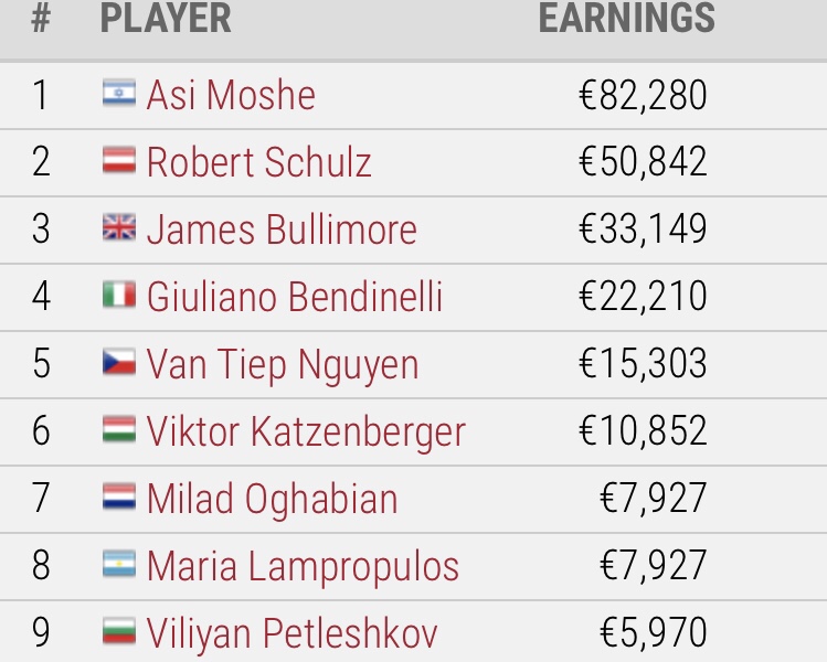 221 entrées ont été comptabilisées sur l’Event #2 des WSOPE qui se déroulent à Rozvadov en ce moment. Il fallait débourser 1650€ pour disputer ce No-Limit Hold’em 6-Max Deepstack. C’est l’Israélien Asi Moshe qui tire son épingle du jeu et empoche 82,280€. C’est le second bracelet WSOP pour le joueur dans sa carrière !