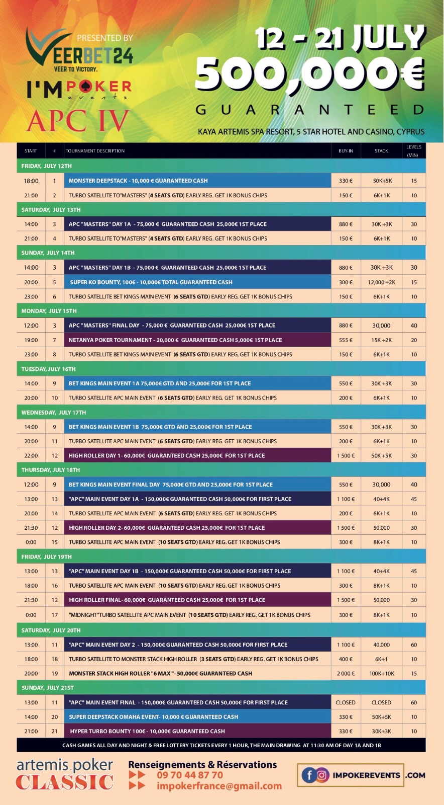 Le festival chypriote propose 10 tournois avec des buy-in qui s’échelonnent entre 300€ et 2.000€. Au total, le festival offre une garantie de 500.000€ pour l’ensemble des épreuves avec la principale, le Main Event à 1.100€ (qui se déroulera du 18 au 21 juillet avec une garantie à 150.000€). De nombreux Side Events sont prévus comme l’APC Masters à 880€ (13 au 15 juillet), le High Roller à 1.500€ (17-19 juillet) ou l’Omaha à 330€ (21 juillet).