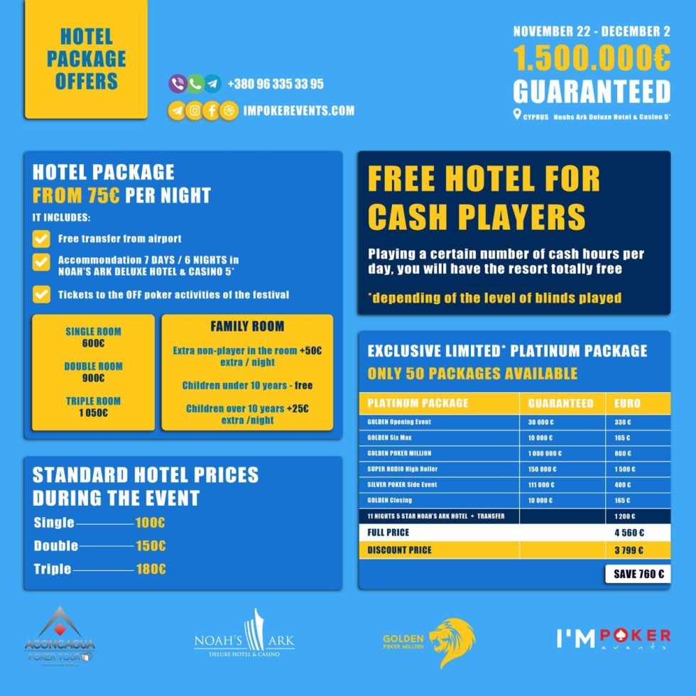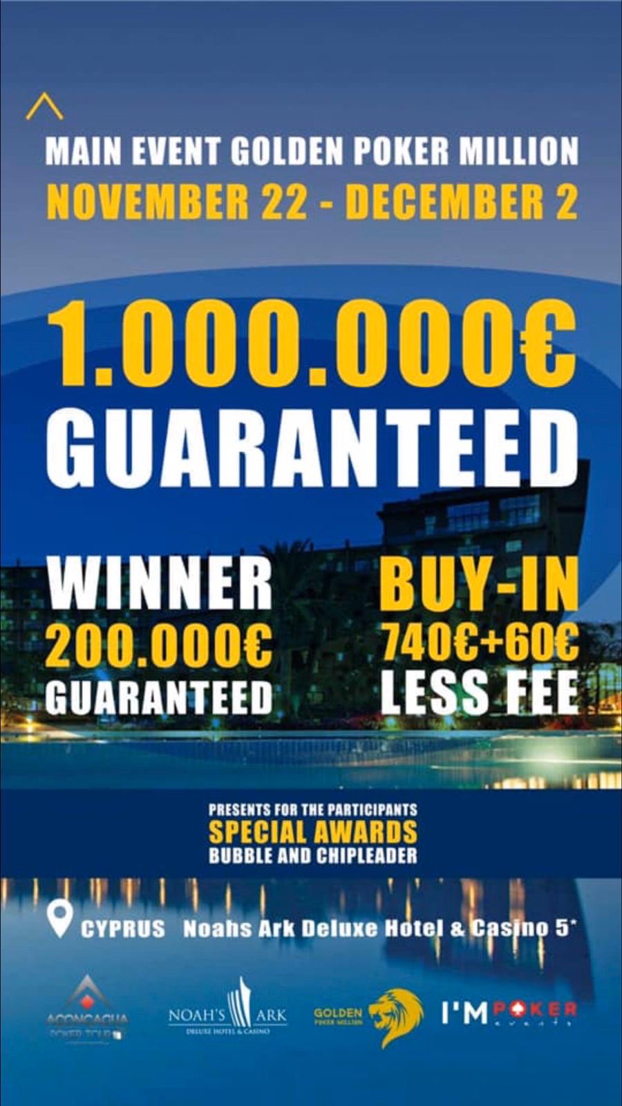 Le Noah’s Ark Deluxe Hotel, un hôtel de standing 5 étoiles à Chypre, va accueillir du 22 novembre au 2 décembre le Golden Poker million : un festival dont le Main Event propose une garantie d’un million d’euros, dont 200.000 promis au vainqueur. De nombreux Side Events avec des Buy-in variés sont aussi au programme. Cet événement organisé par ImpokerEvents promet d’attirer des joueurs du monde entier. Le Cash Game sera aussi à la fête durant cette période.
