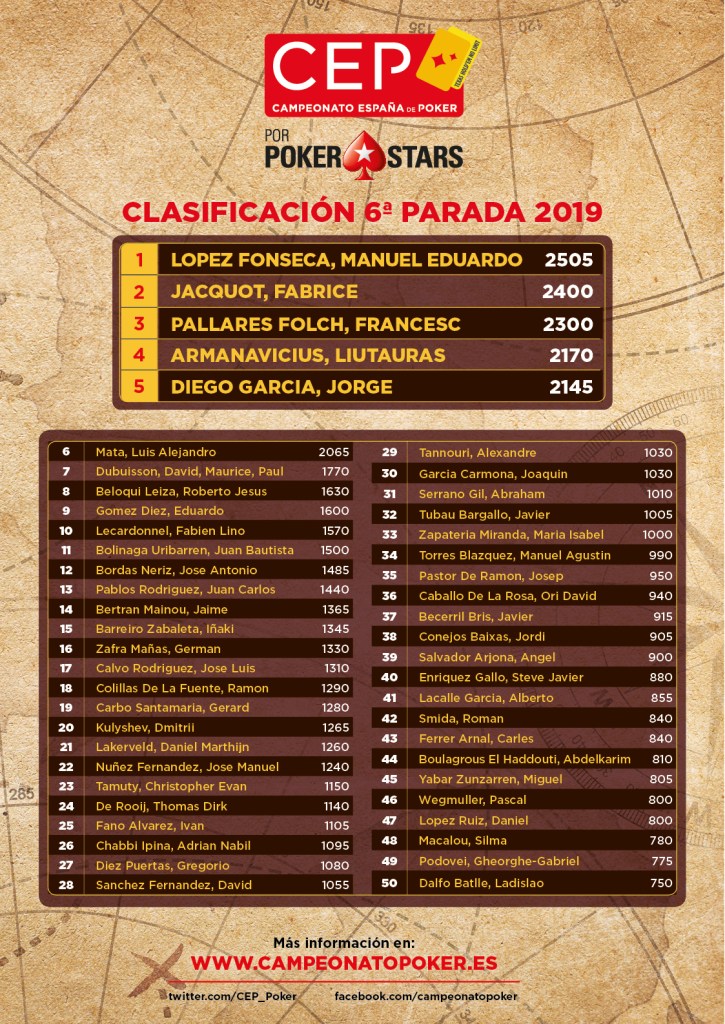 Manuel Eduardo López (2 505 points) arrivera au Casino Peralada en tant que leader du classement général du Main Event, bien qu’il soit suivi de près par Fabrice Jaquot (2 400), Francesc Pallarés (2 300), Liutauras Armanavicius (2 170) et Jorge Diego (2 145), la dernière ligne droite sera donc palpitante.