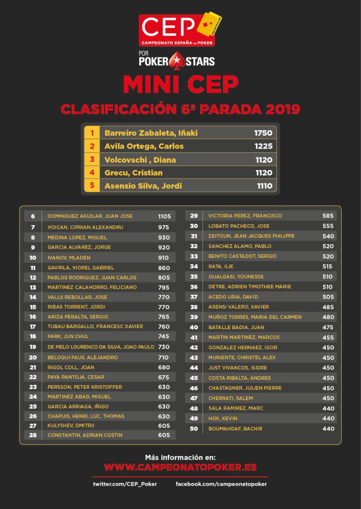Un Mini CEP au Buy-in de 200 € sera aussi organisé au Casino Peralada. Iñaki Barreiro (1 750 points) arrivera au Casino Peralada en tant que leader du classement général, bien que le joueur basque soit suivi de près par Carlos Ávila (1 225), Diana Volcovschi et Cristian Grecu (tous deux avec 1 120 points), Jordi Asensio. (1 110) et Juan José Domínguez (1 105). En plus de l’honneur de se proclamer champion de ce tournoi, le vainqueur recevra également un ticket lui permettant de jouer le Spanish Poker Championship 2020.