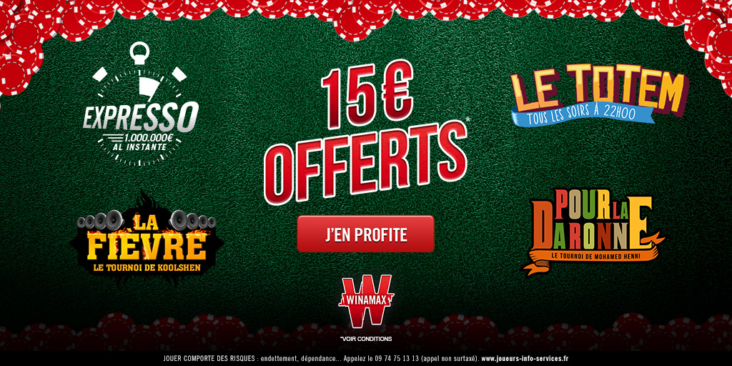 Sur Winamax, en ce moment, vous pouvez profitez d’un bonus de bienvenue poker exclusif : 15€ offerts (pour un dépôt minimum de 15€ sur le site), sous forme de deux tickets, 1 de 5€ et 1 de 10€.