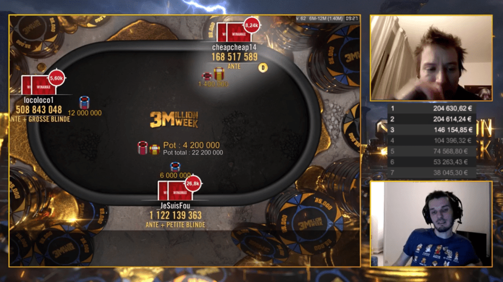 _JeSuisFou_ a dominé en Heads-up locoloco1. L’enjeu principal de ce duel portait sur le montant de la prime annexe : 67 445 € d’un côté, 5 524 € de l’autre. Des chiffres à ajouter pour chacun à un gain de 204 600 €.