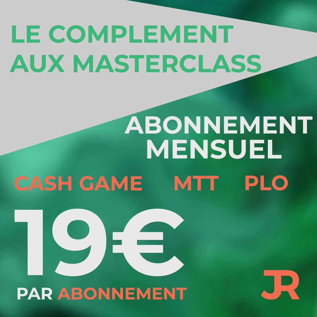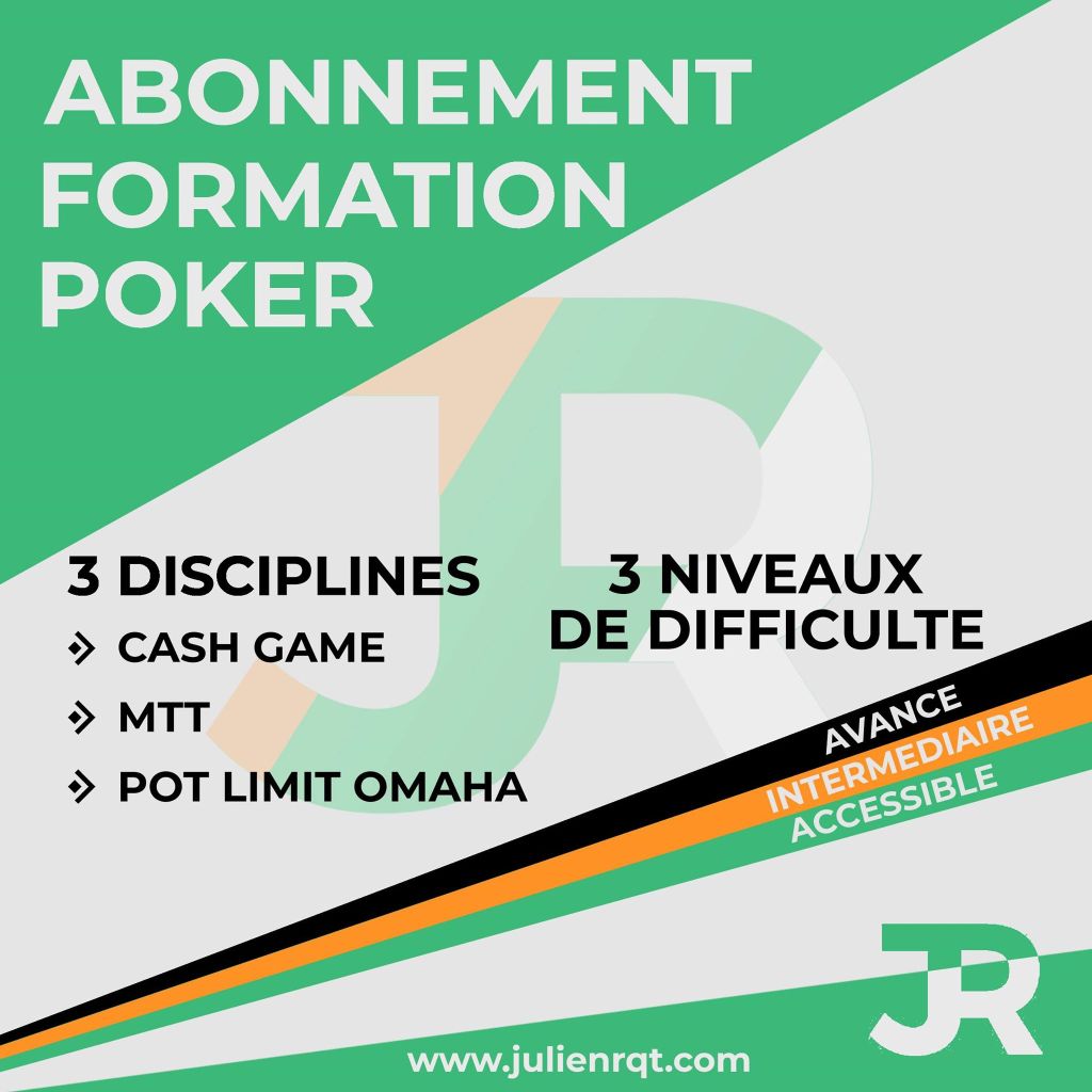 Le joueur a lancé, depuis ce vendredi 17 juillet, une offre très accessible dédiée aux joueurs selon leur niveau et leur format fétiche. JulienRQT propose trois offres d’abonnement dédiée aux différents formats : Cash Game, MTT et Omaha. Dans chaque catégorie de format, le joueur qui s’abonne à accès à toutes les vidéos avec trois niveaux de difficulté un système de couleurs (débutants, intermédiaire et expérimenté). Chaque mois, entre 6 et 8 vidéos sont ajoutées pour chaque format. C’est l’une des offres parmi les plus accessibles du marché : 19€ par mois.