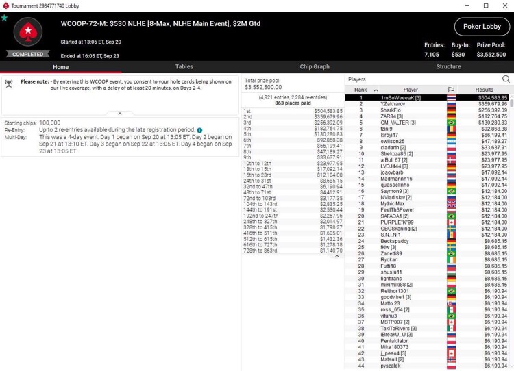 Hier soir, en direct sur la chaine twitch de NutsR, Romain « Imsoweak » Nussmann est devenu champion du monde online en remportant le Main Event des WCOOP sur Pokerstars devant 7105 joueurs. Suivi en direct par 4.000 viewers, il gagne 504.583 dollars et bat le record mondial de gains en stream détenu jusque là par Doug Polk.