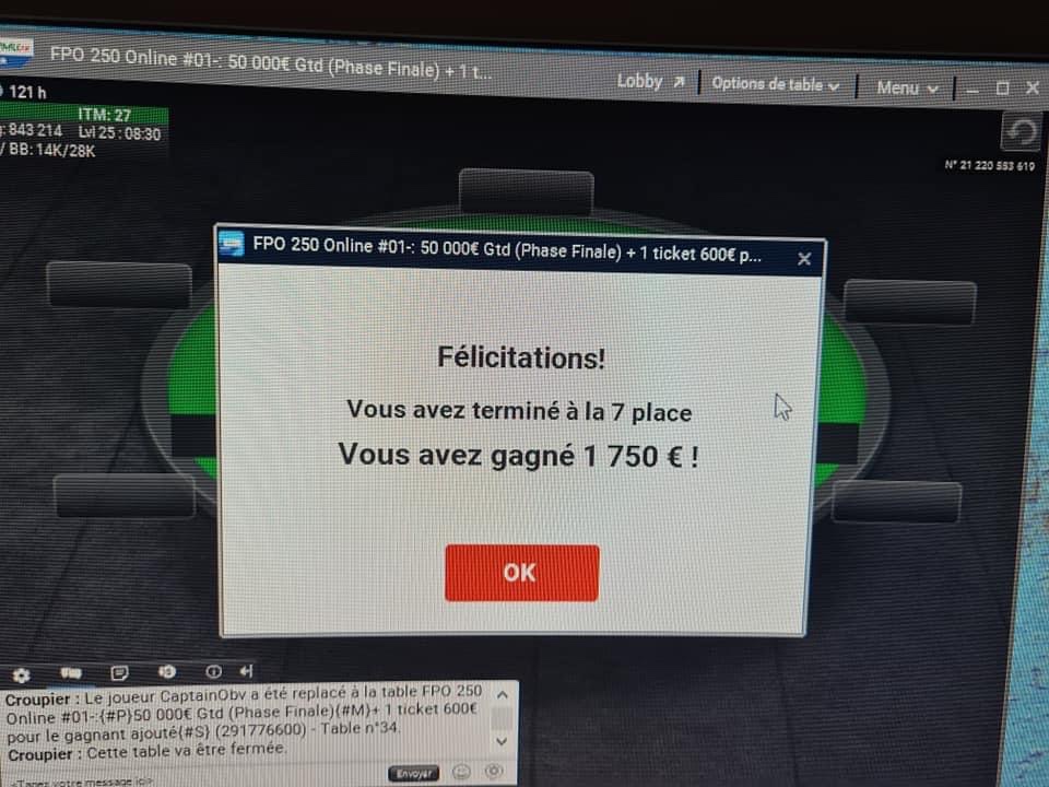 Enfin, le joueur a pris la 7e place sur le FPO 250 pour 1.750 de gains sur PMU Poker !