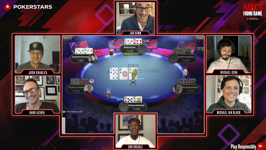 Animé par l’acteur Hank Azaria, les amateurs de poker et les fans de célébrités sont invités à suivre l’événement dans le confort de leur maison. Le premier match à domicile, qui réunissait de nombreuses stars, a été diffusé le dimanche 31 janvier à 19 heures sur la chaîne YouTube de PokerStars. Hank et ses amis Don Cheadle, Jon Hamm, Michael Ian Black, Josh Charles ou encore Michael Cera s’affrontaient pour gagner la plus grosse part des 50 000 dollars au profit de l’association caritative de leur choix.