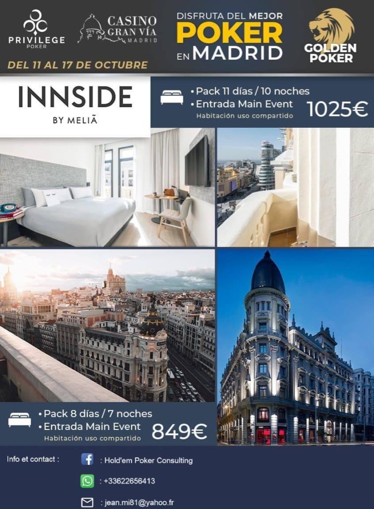 Au cœur de Madrid, le Casino Gran Via Madrid est l’une des places fortes du poker en Espagne. Au mois d’octobre, un beau festival aura lieu avec un Main Event à 400€. Les amateurs de Cash Game seront aussi à la fête avec une belle offre pendant l’événement.