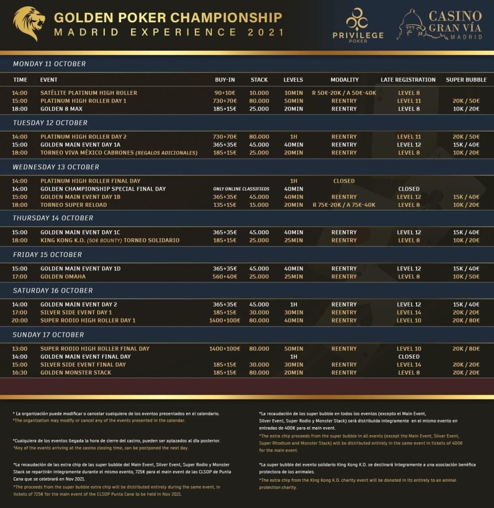 Du 11 au 17 octobre 2021, l’établissement organise une série de tournois dont un Main Event (12 au 17 octobre) au Buy-in de 400 euros. Les joueurs disposeront de 45.000 jetons à faire fructifier sur des niveaux de 40 minutes. Une belle structure qui permettra de pratiquer un beau poker. Un événement qui promet d’attirer les foules. Un High Roller à 1500 euros est aussi au menu (16-17 octobre). Un tournoi Omaha à 600 euros est aussi prévu. A noter que les tournois sont reentry.