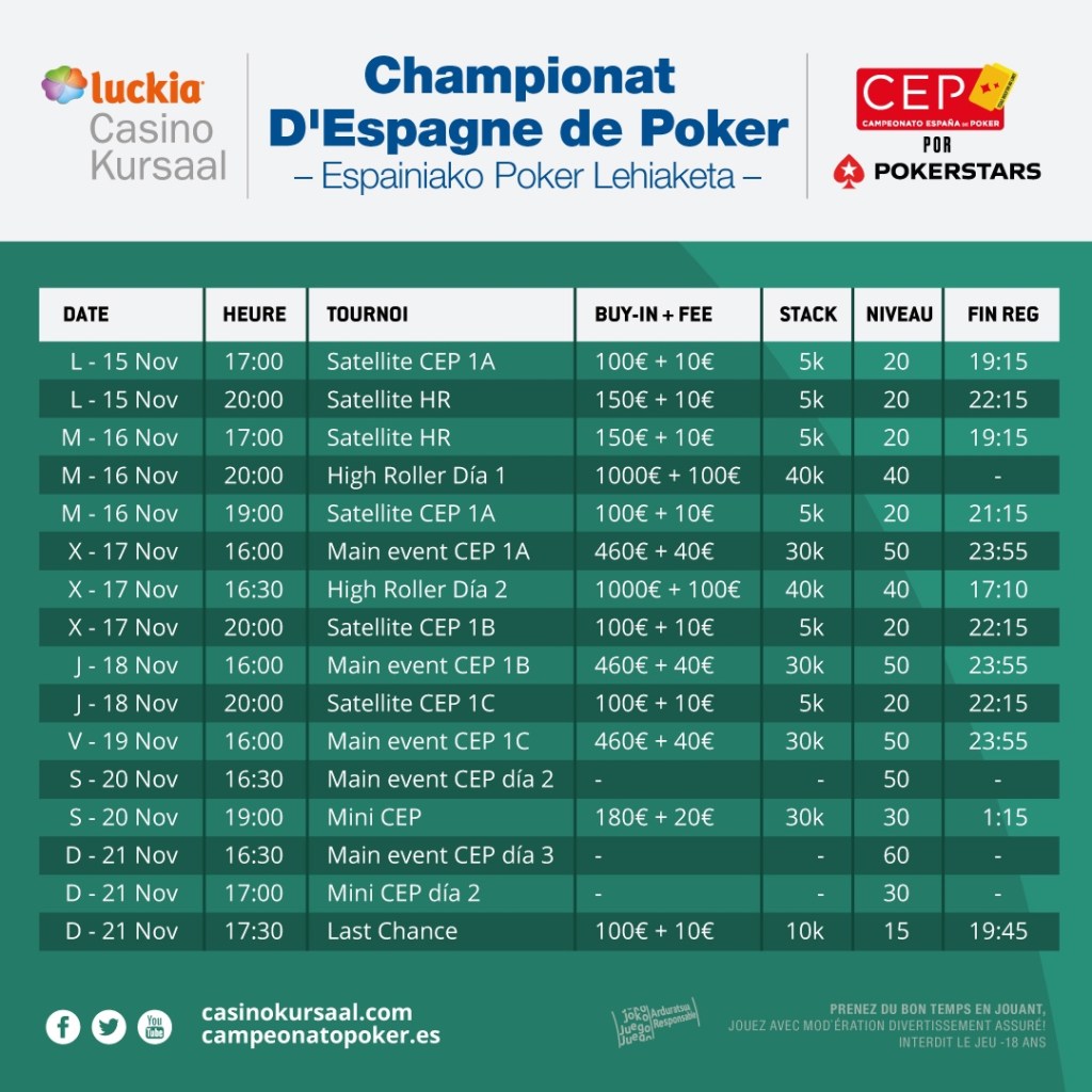 Ce rendez-vous comportera quatre événements : le Main Event à 500€, le Mini CEP à 200€, le High Roller à 1.100€ et le Last Chance à 110€. 2 satellites Live pour se qualifier pour le Main Event et le High Roller sont prévus. Ils se dérouleront au Luckia Casino Kursaal, le samedi 23 et 30 octobre et le 6 et 13 novembre à 18h. Avec un buy-in de 100€+10€.