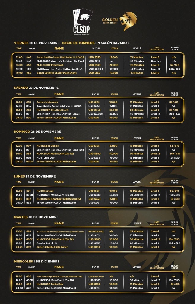 Sur l’ensemble du festival, du 5 novembre au 5 décembre, 77 tournois sont au programme pour une garantie globale de 1 millions de dollars. Les plus beaux tournois du festival se dérouleront du 26 novembre au 5 décembre. Le temps fort du festival sera bien sûr le Main Event à 880$ (28 novembre au 5 décembre) avec pas moins de 7 journées de départ.