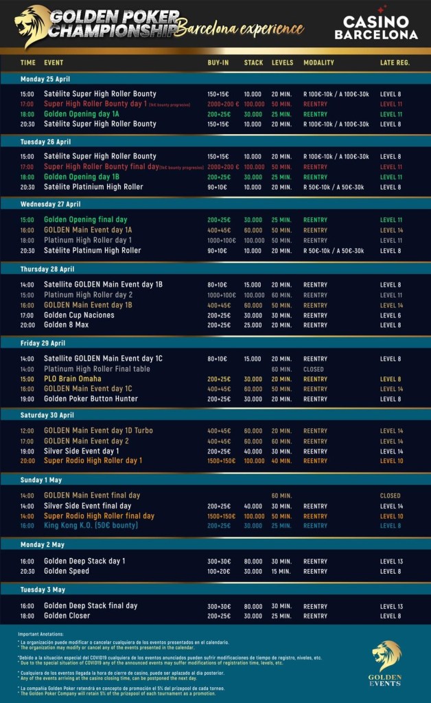Le Casino Barcelona est l’une des places fortes du poker en Europe. Du 25 avril au 3 mai, un beau festival aura lieu avec un Main Event à 400€. Les amateurs de Cash Game seront aussi à la fête avec une belle offre durant l’événement.