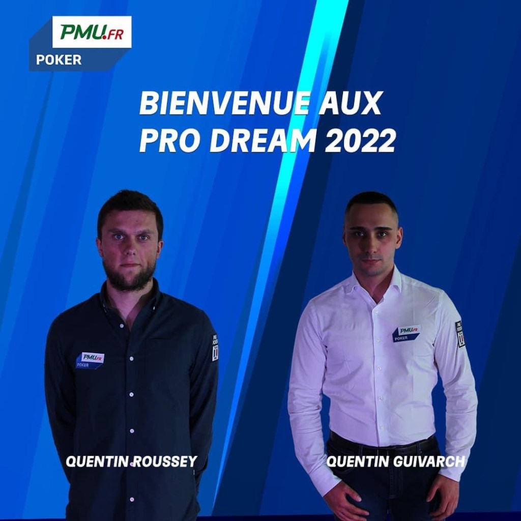 Quentin Guivarch « shadowalk3r », 25 ans, et Quentin Roussey « Maitre Wazo », 30 ans, ont remporté la 8e édition de Pro Dream organisé par PMU Poker, et seront les nouveaux coéquipiers de Julien Martini pour la saison 2022 au sein de la Team Pro. Le jury a été impressionné par leur prestation tout au long de la compétition, par la qualité de leur jeu et par leurs profils complémentaires. Accompagnés par Greg Céran-Maillard, le Team Manager de l’équipe PMU Poker, ils participeront durant un an aux tournois de Poker les plus prestigieux en France et dans le monde, dont les championnats du Monde Las Vegas. Dès mardi 17 mai, ils seront présents sous leurs nouvelles couleurs au France Poker Open by PMU Poker à La Grande Motte.