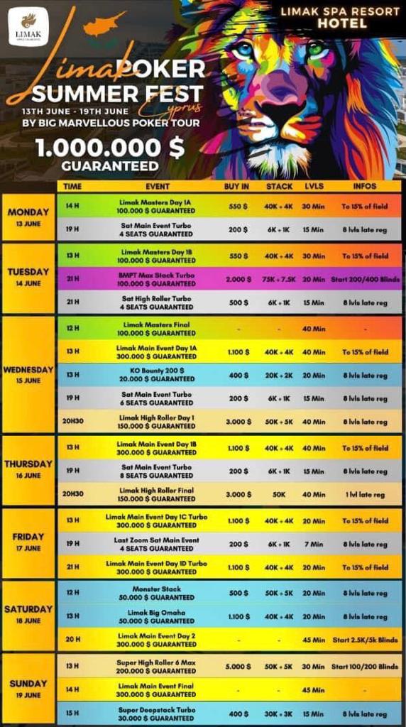 Le festival chypriote propose pas moins de 9 tournois avec des buy-in qui s’échelonnent entre 400 à 5.000$. Il s’agit d’un festival World Marvellous Poker Series by Roger Hairabedian. Au total, le festival offre une garantie de 300.000$ pour le Main Event à 1.100$ (qui se déroulera du 15 au 19 juin). La structure est vraiment belle avec 40.000 jetons de départ des niveaux de 40 puis 45 minutes. De quoi pratiquer un beau poker. De nombreux Side Events sont prévus comme le High Roller à 3.000$ (15-16 juin) ou encore un Masters à 550$.