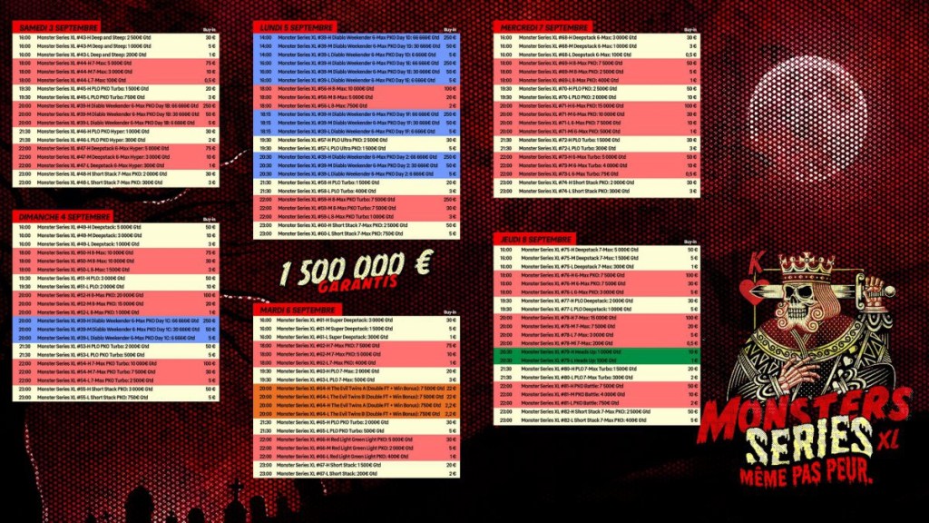 PMU Poker proposera durant les Monsters Series XL quatre Main Event sous le format « Flight », avec une multitude de « Day1 ». Et pour les joueurs à 4 cartes, un Main Event PLO par K.O progressif sera aussi au menu, avec des buy-in à 3€, 10€ et 50€.