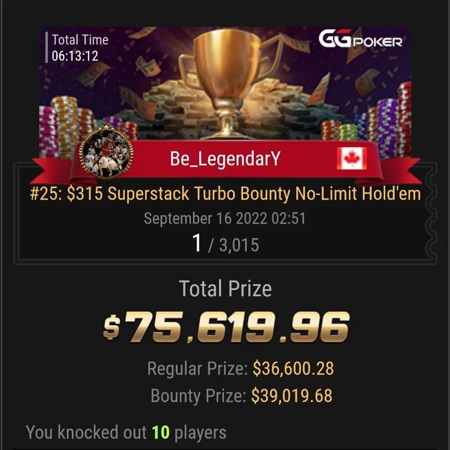 Sur GGPoker, Be_LegendarY, son pseudo, a remporté l’Event 25 des WSOP Online, un tournoi à 315$ Super stack Turbo Bounty No-Limit Hold’em (3.015 entrants) pour 75.619,96$ dont 39.019$ en primes. Ce n’est pas le plus gros gain à une table virtuelle pour le Français. En 2020, sur PokerStars.com il avait décroché un SCOOP et pour 216.617$.