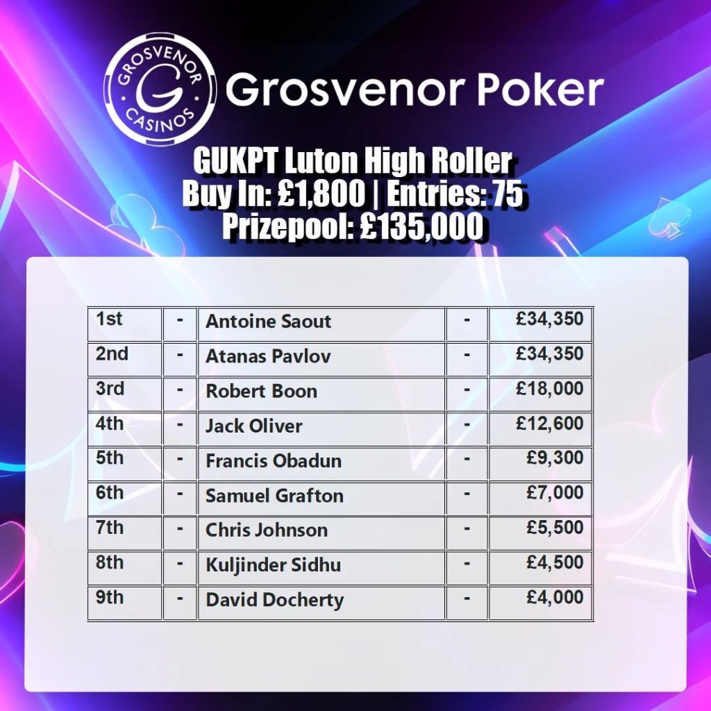 Au total, 75 entrants ont été comptabilisés sur ce tournoi pour un prizepool de 135.000£. En table finale, on retrouvait du beau monde, notamment Sam Grafton. En Heads-up, Saout a dominé Atanas Pavlov qui repart avec le même gain que le Français suite à un deal.