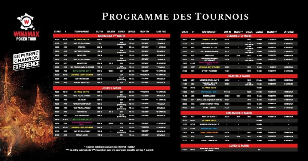 En plus du Main Event qui s’annonce XXL avec six journées de départ qui auront lieu du 1er au 3 mars, on retrouvera au menu de nombreux tournois pour toutes les bourses tels que le Battle Royale (750 €), le Magnum (200 €), le Monster Stack (400 €), le High Roller (1500 €). Très en vogue en ce moment, le format Mystery Bounty figure aussi au programme avec deux tournois à 750€ et 300€ !