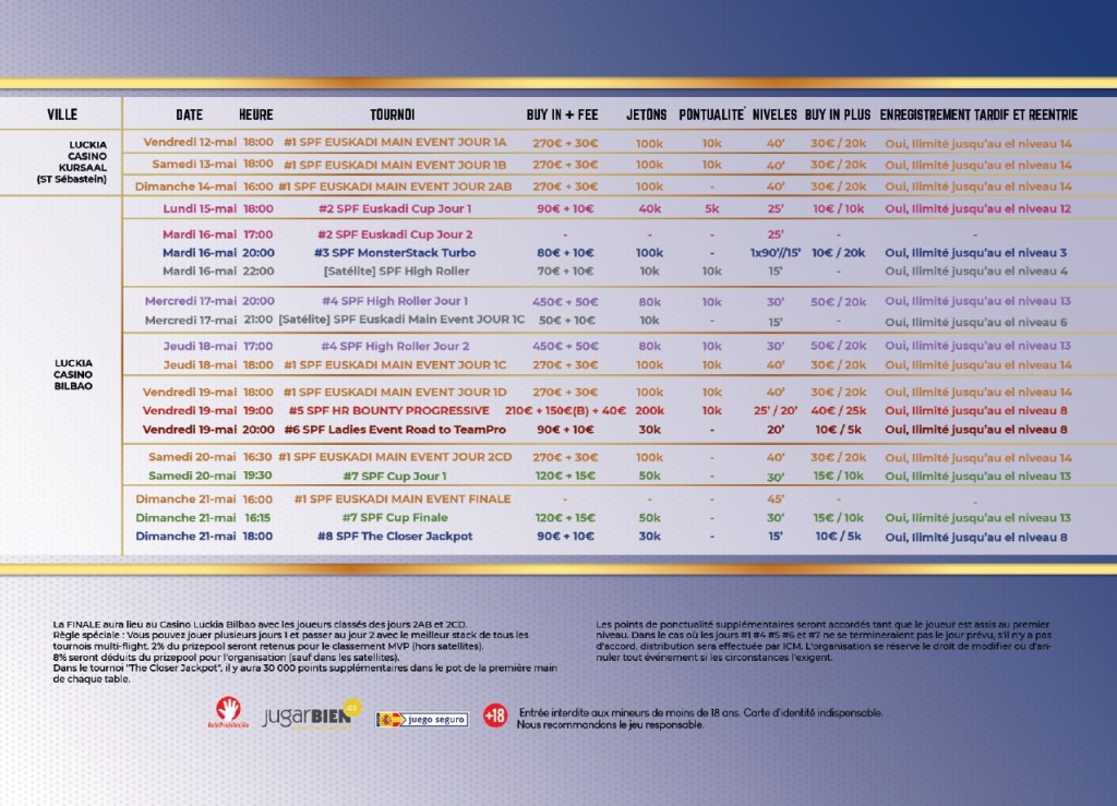 La phase à San Sebastien aura lieu les 12, 13 et 14 mai. Par la suite, à partir du lundi 15 mai, une offre de 10 tournois aux buy-in variés aura lieu au Casino Bilbao. Les joueurs pourront disputer des tournois à partir de 90€. Un High Roller à 500€ est aussi au programme. Des satellites live permettront aussi de se qualifier à moindres frais.