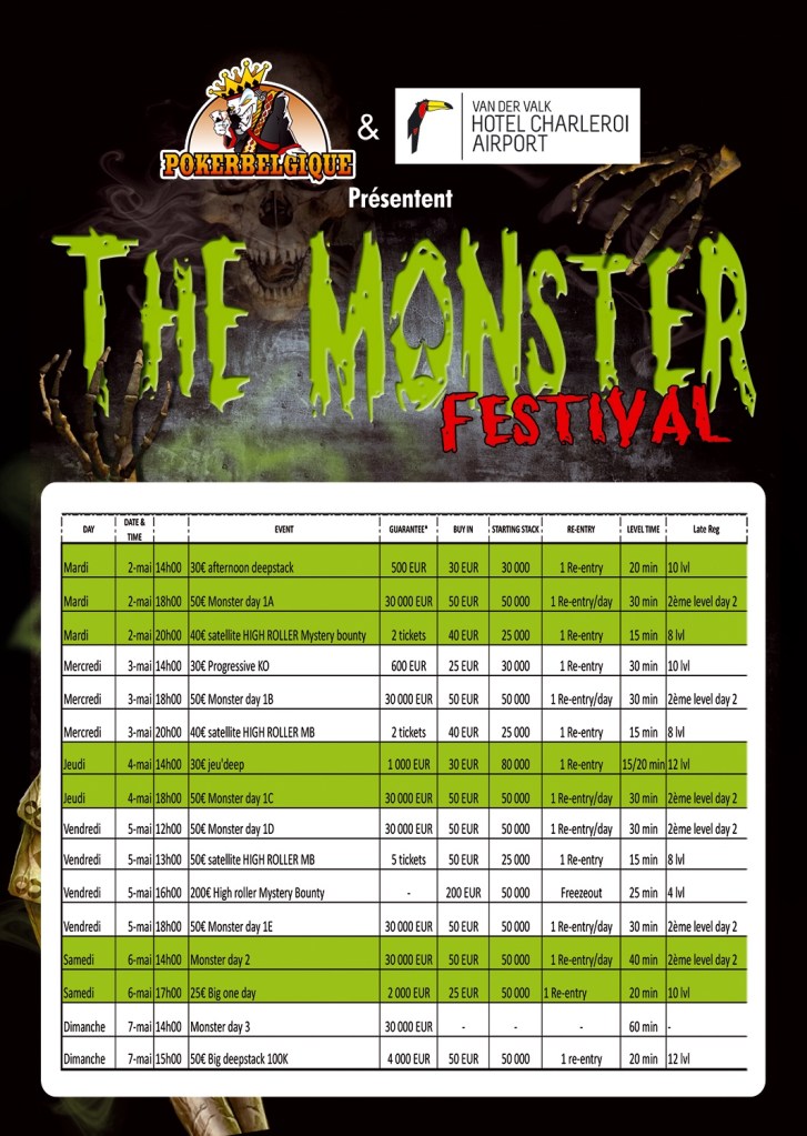 Sur le Monster Day à 50€ qui constitue le Main Event du festival, 5 journées de départ sont prévues. Les joueurs devront faire fructifier leurs 50.000 jetons de départ et des niveaux de 30 puis 40 minutes.