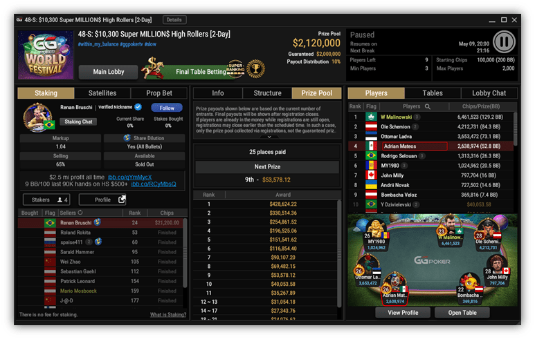Sur ce tournoi, un total de 212 joueurs ont payé les 10.300 $ d’inscription pour jouer le tournoi hebdomadaire le plus important du poker en ligne. L’Espagnol Nacho a terminé à la 15ème place pour 27 343 $. Adrián s’est qualifié pour une table finale qui se jouera cet après-midi et où les joueurs sont assurés de 53.578 $.