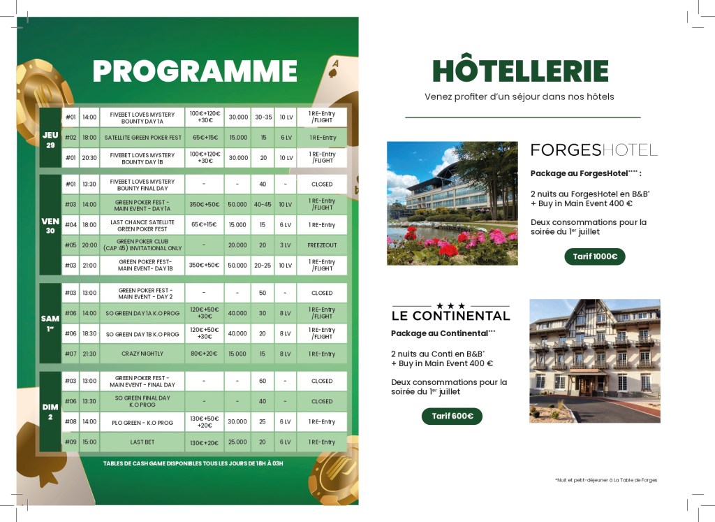 Des packages Continental et ForgesHôtel sont proposés à des tarifs très avantageux pour se loger sur place. Des packages à 600€ comprennent le Buy-in du Main Event (400€) et deux nuits d’hôtel au Continental 3* avec les petits déjeuners + 2 verres pour la soirée de samedi.