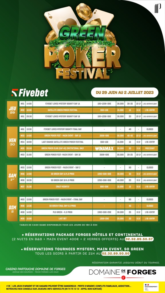 Du 29 juin au 2 juillet, le Casino de Forges-les-Eaux, à quelques encablures de la capitale, renoue avec les tournois de poker en proposant un festival en partenariat avec Fivebet. Au programme un Main Event à 400€, de nombreux Sides Events et de multiples animations.