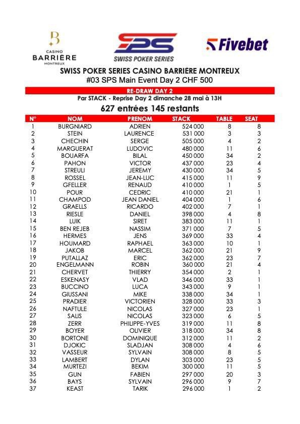 Sur le Main Event à 500 CHF, 627 entrants ont été recensés. Une affluence XXL liée à l’énorme attente des joueurs suisses d’organiser un beau festival chez eux. 145 joueurs se sont qualifiés pour le Day 2 ! C’est Adrien Burgniard qui a mis en sac le plus de jetons (524.000), suivi de Laurence Stein et Serge Chechin.