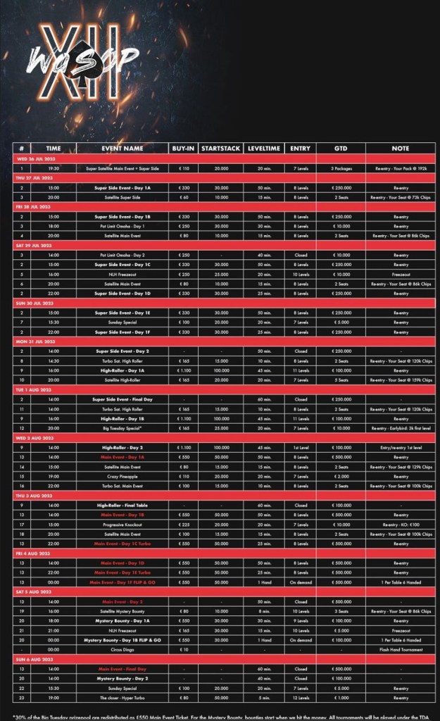 Au programme, 12 jours de compétition effrénée avec en guise d’hors d’œuvre le 27 juillet un Super Side Event à 330€ avec 250.000€ garantis. L’année dernière, 939 entrants avaient été comptabilisés durant les 4 journées de départ. En point d’orgue, on retrouvera le Main évent à 550€ et 500.000€ garantis sur lequel 6 Jours 1 seront proposés ! L’an dernier, c’est le Néerlandais Bayer Demirci qui s’était imposé pour 67.132€.