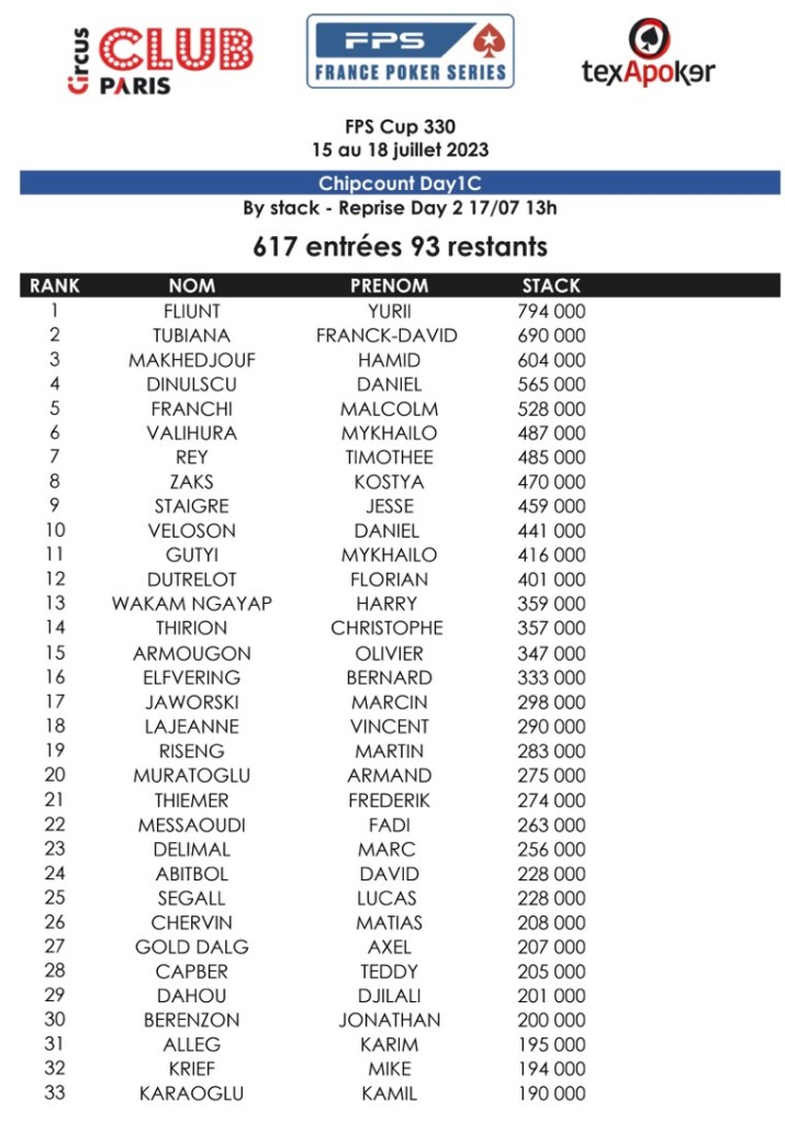 Sur le Day 1C, 617 entrants ont été recensés pour 93 restants. C’est Yurii Fliunt qui a amassé le plus de jetons (794.000) suivi de Franck Tubiana (690.000) et Hamid Makhedjouf (604.000). Parmi les qualifiés pour le Day 2, on peut citer Karim Alleg, Philippe Pertuisot (vainqueur du Winamax Poker Tour en 2012) ou Smain Mamouni.