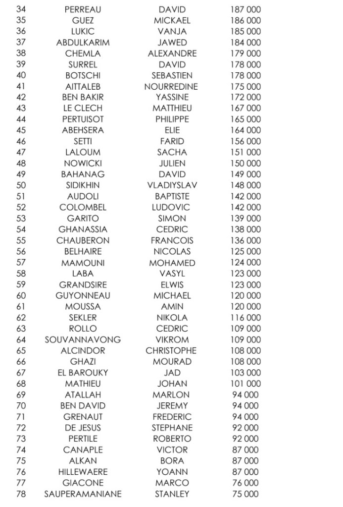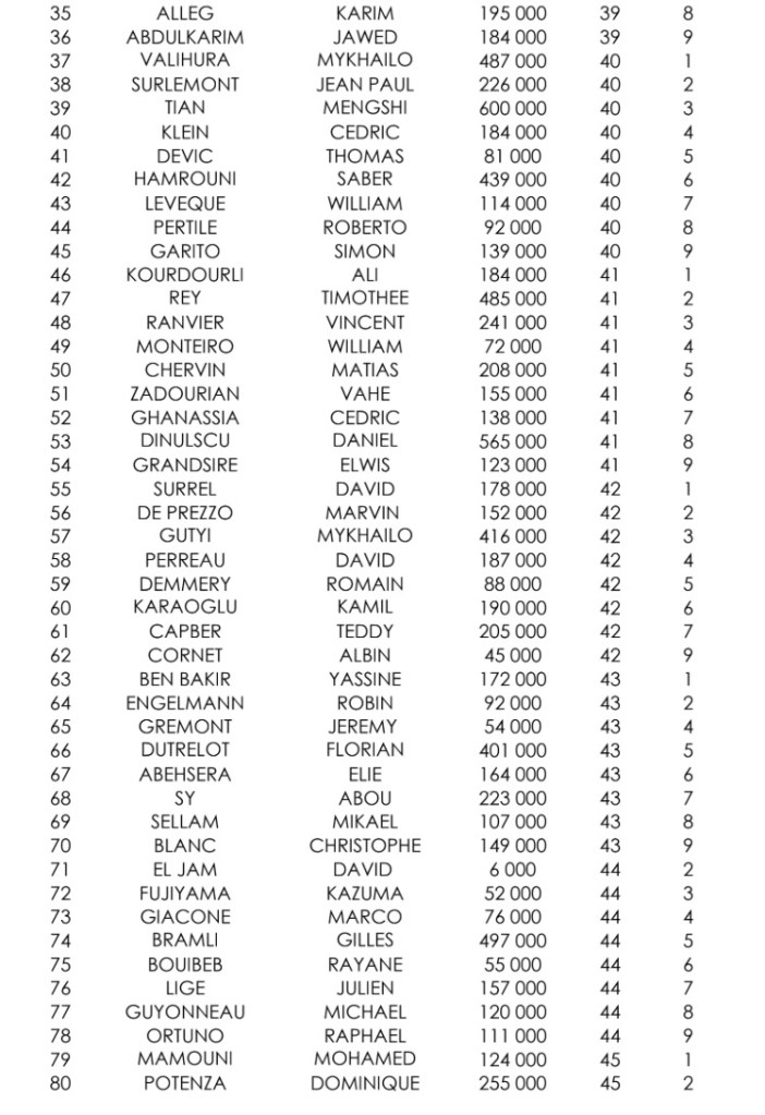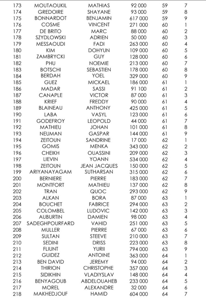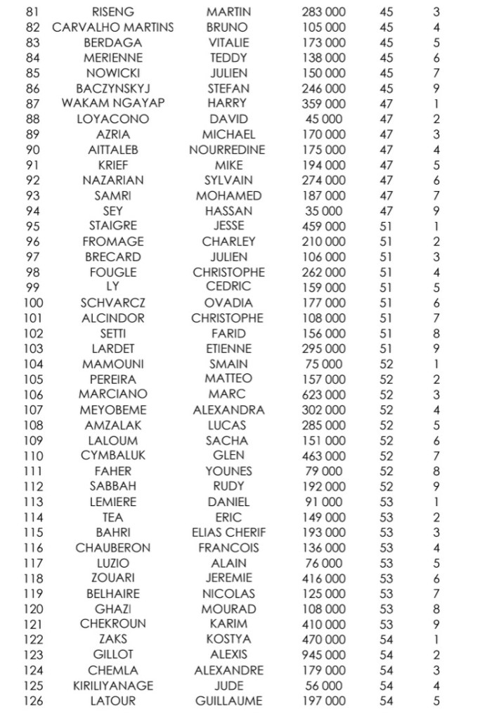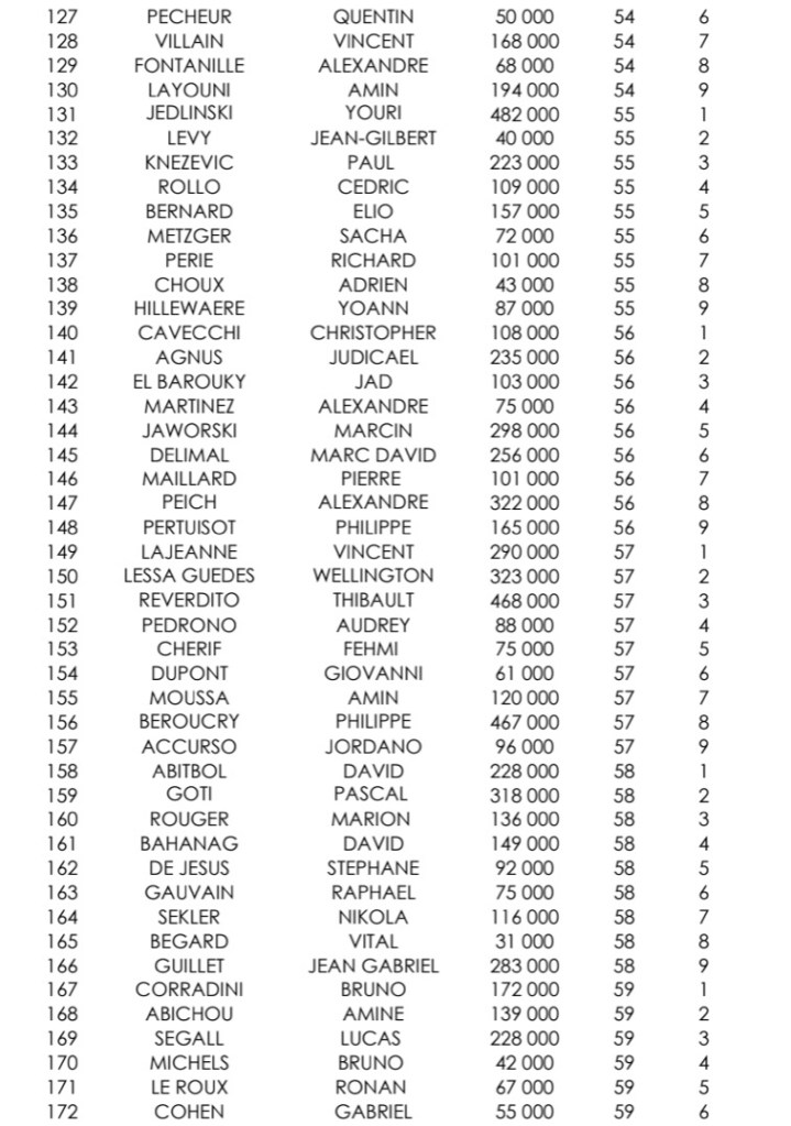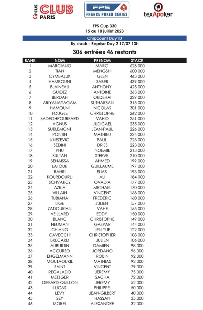Sur le Day 1D, 306 entrants ont été recensés. C’est Marc Marciano qui a empilé le plus de jetons (623.000), suivi de Mengshi Cymbaluk et Saber Hamrouni. Parmi les qualifiés : Jean-Paul Surlemont et Julien Brecard.