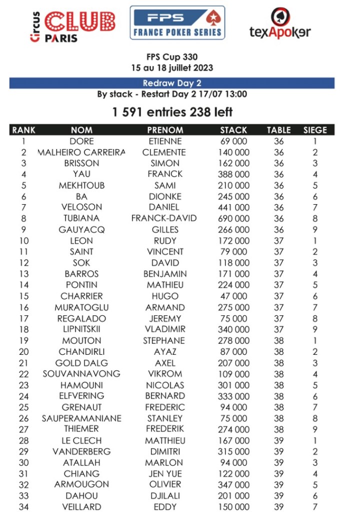 Au total, 1591 entrants ont pris part à ce tournoi sur les 4 journées de départ. Une belle affluence. 238 joueurs seront de retour pour le Day 2. Tous les détails sur les festivals sont à retrouver sur http://www.poker.paris !