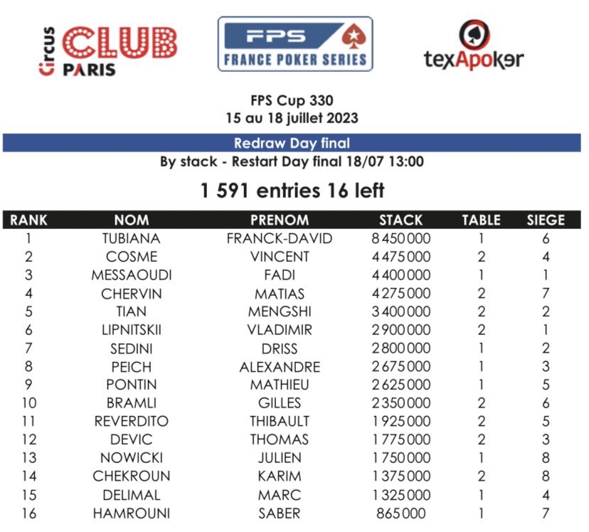 C’est Franck Tubiana qui mène les troupes avec 8.450.000 jetons. Il est suivi par Vincent Cosme et Fadi Messaoudi. Parmi les survivants, on retrouve Mathieu Pontin, aka « lapoooonte ». Thibault Reverdito peut encore rêver du titre. Le vainqueur empochera 71.800€.