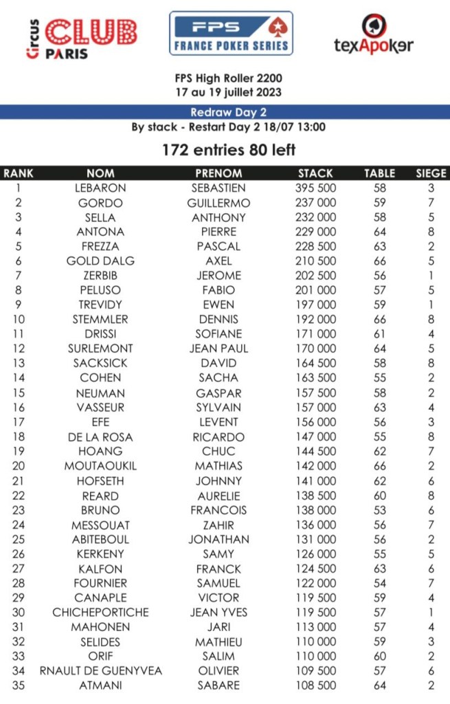 Sur le High Roller, 172 entrants ont été recensés et 80 joueurs ont décroché leur ticket pour la suite de la compétition. C’est Sebastien Lebaron qui vire en tête (395.000 jetons), suivi de Guillermo Gordo (237.000) et Anthony Sella (232.000).