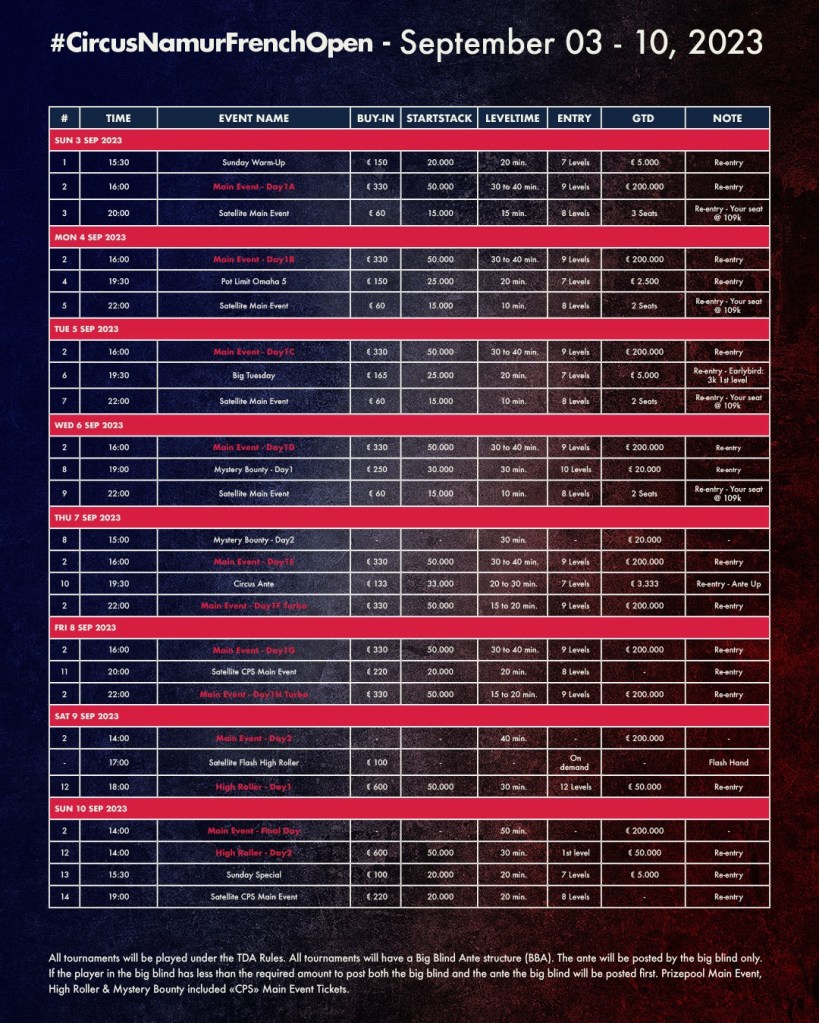 Du 3 au 10 septembre, le Circus Casino Résort Namur propose un festival : le Circus Namur French Open. L’événement est doté d’une garantie de 200.000 euros sur le Main Event à 330€. De nombreux joueurs, venus de toute l’Europe, devraient faire le déplacement.