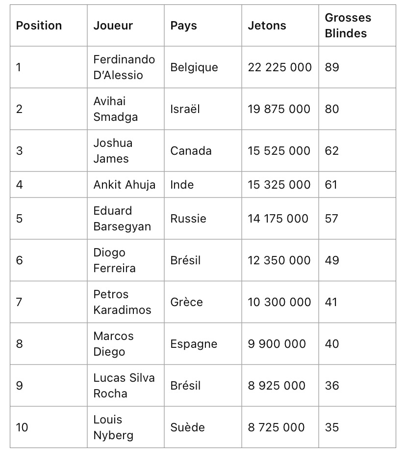 Avihai Smadga (19.875.000), Joshua Frazer-James (15.525.000), Ankit Ahuja (15.325.000) et Eduard Barsegian (14.175.000) complètent le top cinq provisoire.