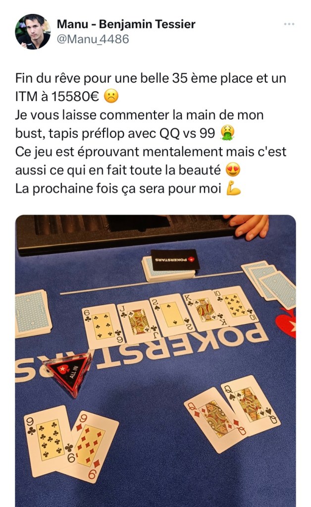 Nabil Benchaouch s’est hissé à la 68e position, empochant 11.800 €. Plus loin dans le classement, Marius Lussi et Samy Salah se sont placés respectivement 80e et 84e, emportant chacun 10.250 €. Joseph Bardakji, Jinyong Wu et Ewen Trevidy, chacun repartant avec 10.250 €.