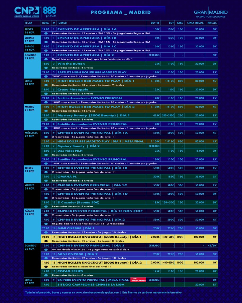 Au programme de ce festival de 11 jours : pas moins de 16 tournois. La table finale du Main Event se jouera le lundi 27 novembre. Le même lundi, à 17h00, se jouera également le Sit&Go des champions des étapes CNP888 LA LIGA où un pack Team Pro pour la 12ème saison sera mis en jeu.