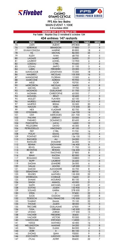 Le Jour 2 de l’épreuve se déroulera ce vendredi 6 octobre dès 13h avec encore deux niveaux d’une heure d’inscriptions tardives et re-entry. Ce sera aussi le début de la FPS Cup à 330€ avec le Jour 1A à 18h puis le Jour 1 du High Roller à 2 200€ à partir de 21h.