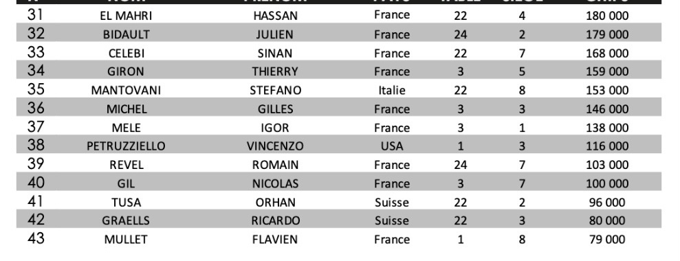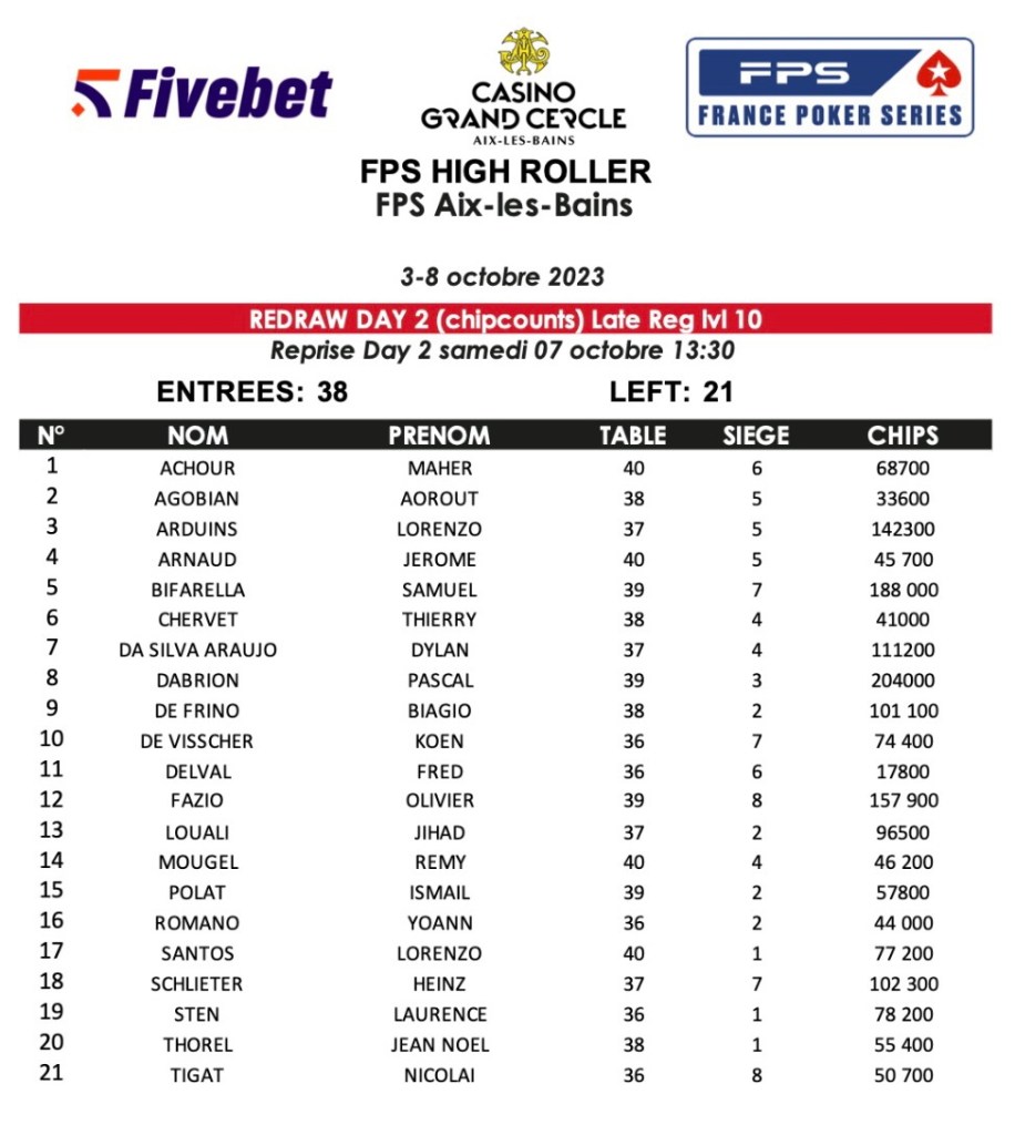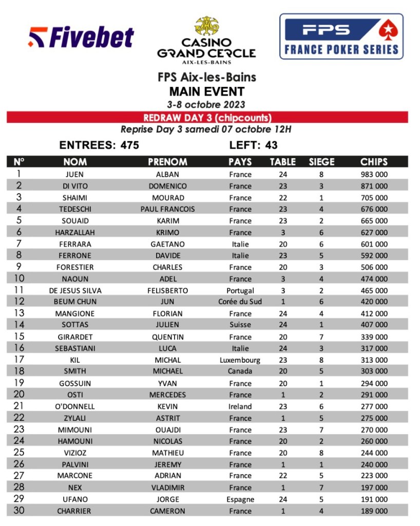 Pendant ce temps-là, la FPS Cup à 330€ a commencé avec 130 entrants au Jour 1A, avec 20 joueurs qualifiés. C’est Jonathan Debarre qui vire en tête avec 412.000 jetons. Joseph Carlino fait partie des qualifiés pour le Day 2. Le joueur a eu l’occasion de briller par le passé au Casino Grand Cercle.