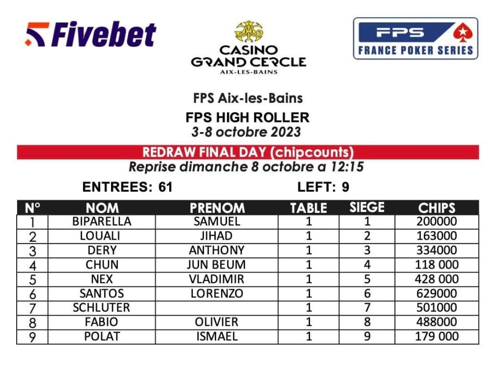 Pendant ce temps-là, la FPS Cup à 330€ a enregistré une affluence de 427 entrants pour 64 restants au Jour final, tous assurés d’une place dans l’argent et d’un mincash de 510€. Le vainqueur empochera 24 066€.