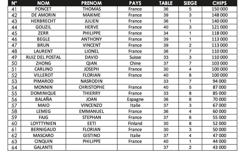 Parmi les joueurs qui avaient les plus petits tapis lors de la formation de la table finale, Ouajdi Mimouni a réalisé une remontée impressionnante en fin de journée. Parti de moins d’un million de jetons, il a presque doublé pour atteindre 1.945.000 jetons. Il a ainsi légèrement devancé Abdelkrim Harzallah, qui possédait 1.790.000 jetons, ainsi que le Canadien Michael Smith, avec 1.700.000 jetons.