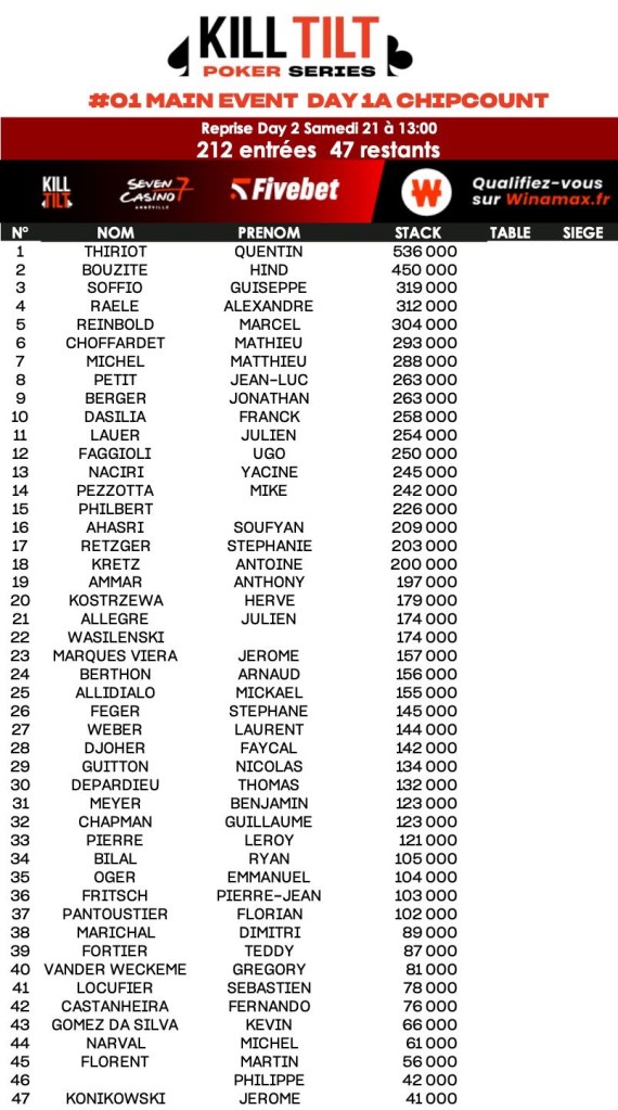 47 joueurs se sont qualifiés pour le Day 2 qui aura lieu samedi. C’est Quentin Thiriot qui mène les troupes avec 536.000 jetons, suivi de Hind Bouzite (450.000) et Guiseppe Soffio (319.000).