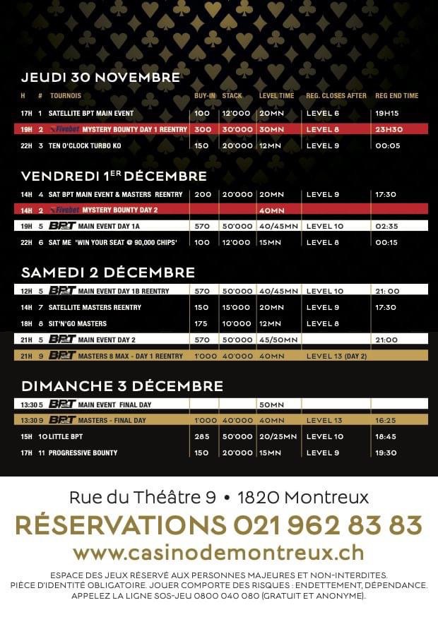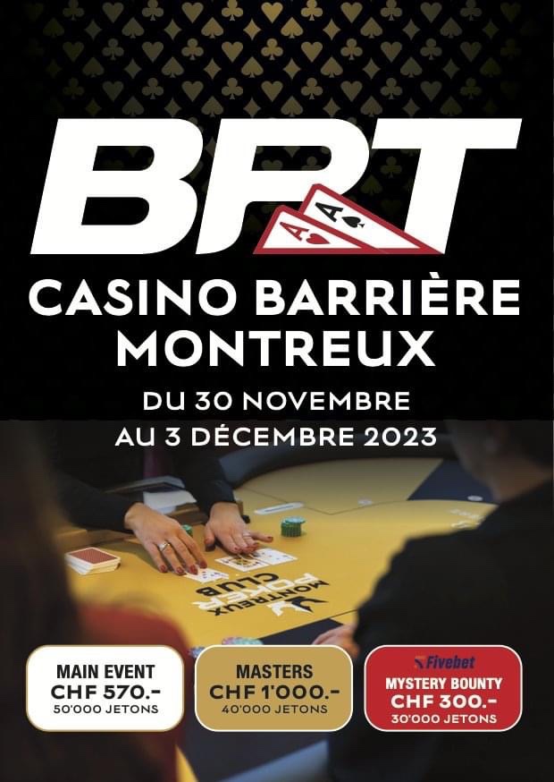Le Barriere Poker Tour conclut sa saison par une étape finale à Montreux du 30 novembre au 3 décembre. Les joueurs suisses et frontaliers auront l’occasion de profiter d’un beau festival comprenant un Main Event à 570€, un Masters à 1 000€ et un Mystery Bounty à 300€ by Fivebet en guise d’ouverture.