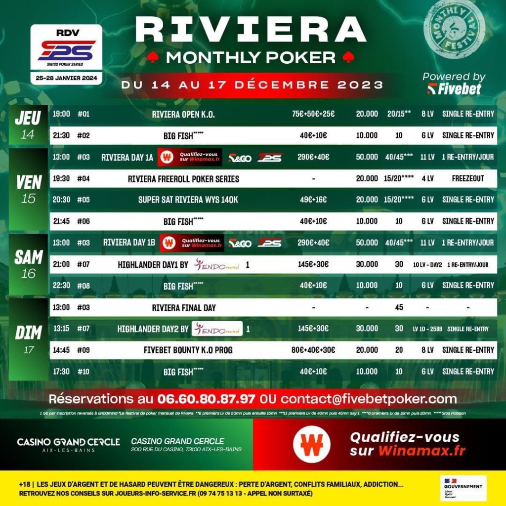 Le Riviera Monthly Poker Festival, du 14 au 17 décembre au Casino Grand Cercle à Aix-les-Bains, promet une fin d’année en beauté pour les passionnés de poker. Ce festival, qui précède les Swiss Poker Series du 24 au 28 janvier 2024, propose un programme revigorant avec plusieurs nouveautés.