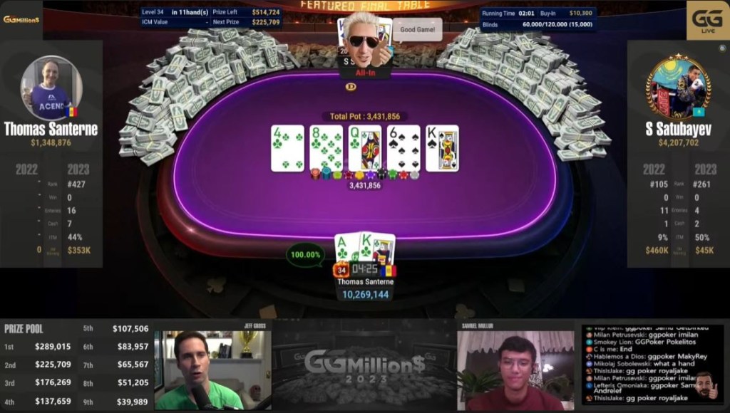 Il y a quelques jours, le Français Thomas Santerne s’est offert un joli cadeau de Noel en remportant le Christmas GGMILLION$ pour 289.015$ dominant en heads-up, le coriace Shyngis Satubayev. Ce hebdomadaire à 10.300$ réunit la crème du poker mondial sur GGPoker.