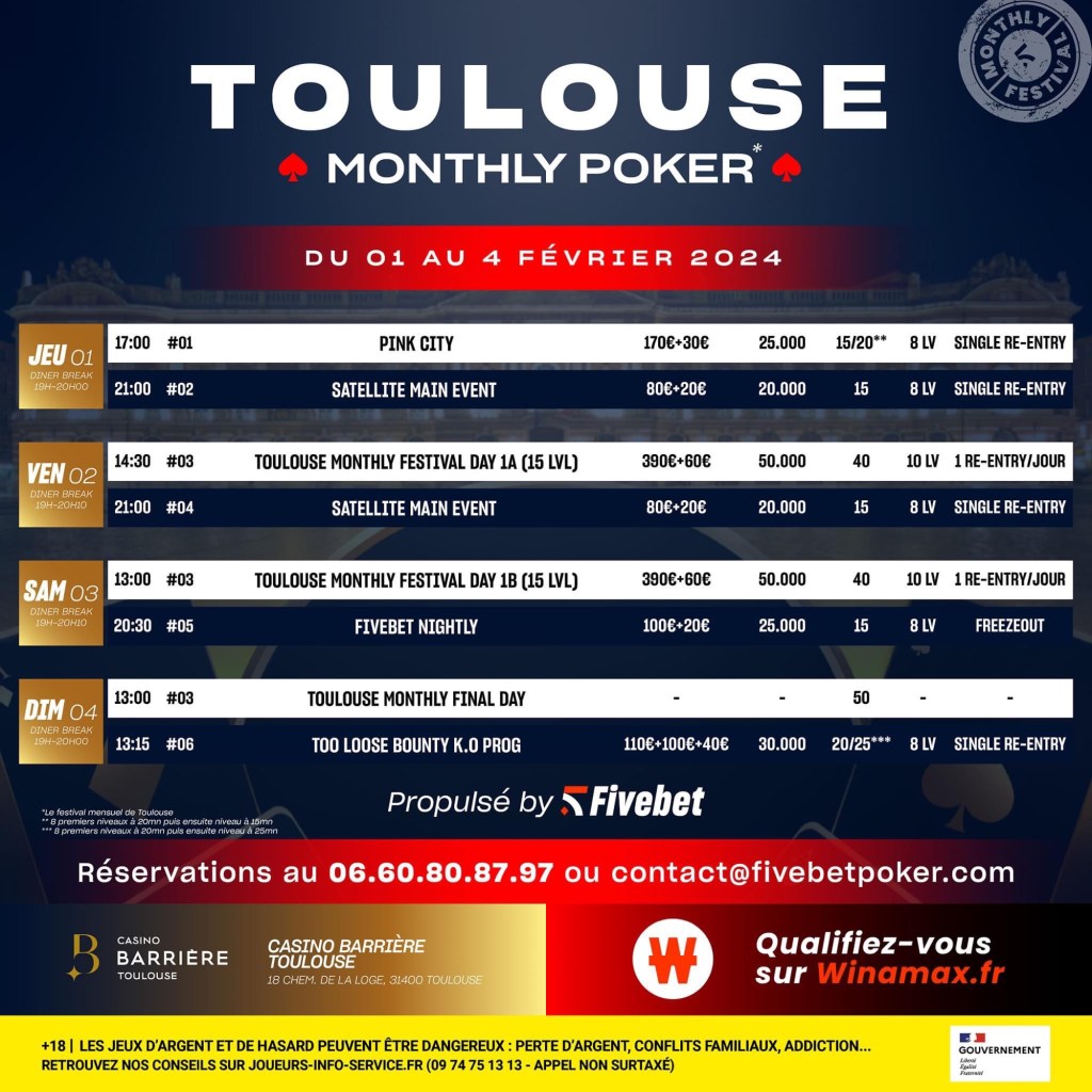 Place forte du poker dans le Sud-Ouest, le Casino Barrière Toulouse organise un Monthly Poker du 1er au 4 février en partenariat avec Fivebet.